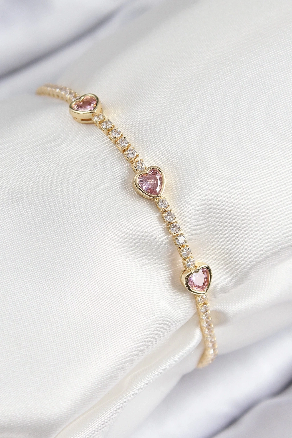 BFS Pirinç Zirkon Taşlı Pembe Kalp Model Gold Renk Kadın Bileklik