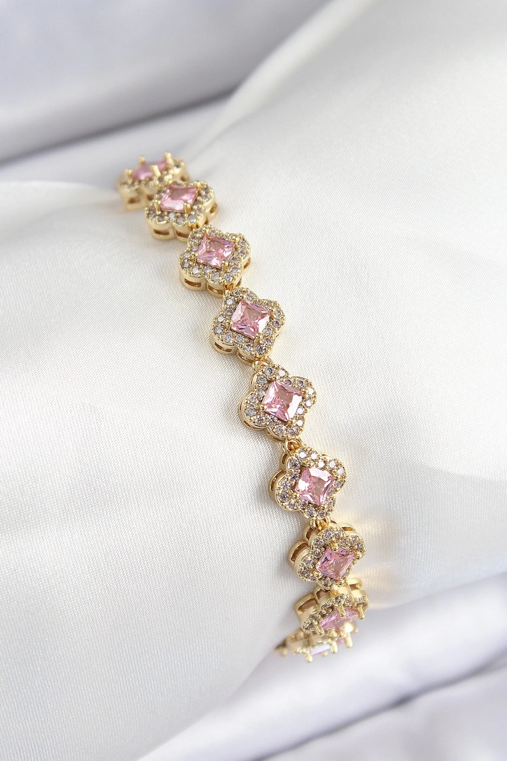 BFS Pirinç Zirkon Taşlı Pembe Yonca Baget Model Gold Renk VIP Seri Kadın Bileklik