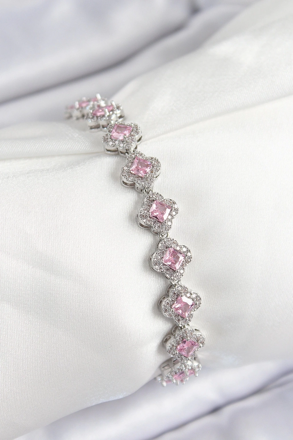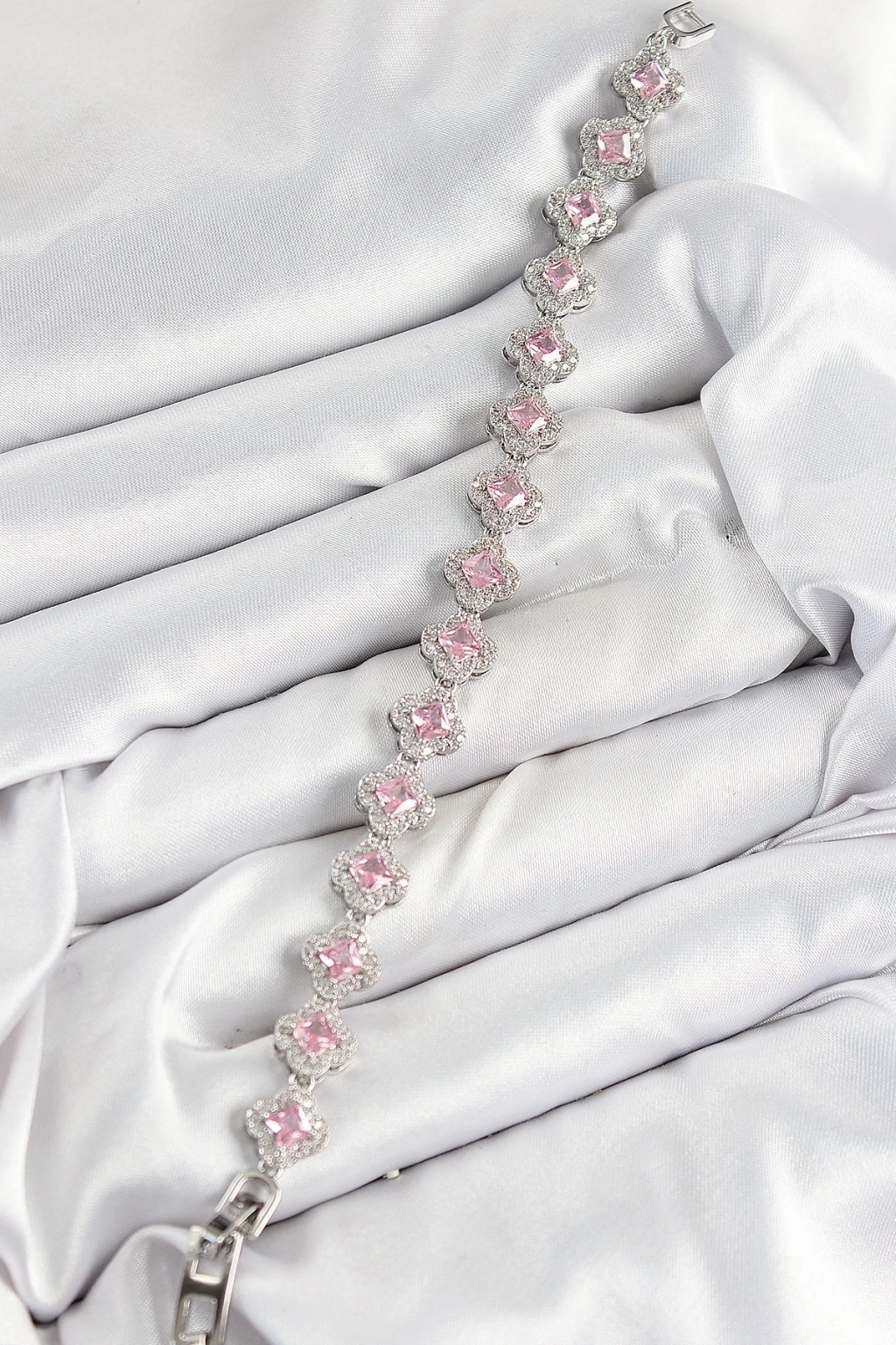 BFS Pirinç Zirkon Taşlı Pembe Yonca Baget Model Gümüş Renk VIP Seri Kadın Bileklik