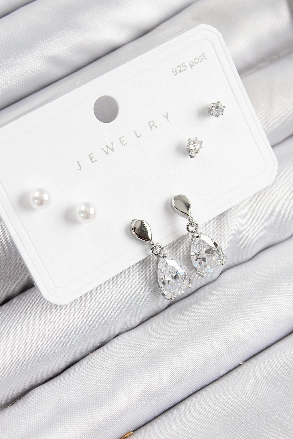 BFS Pirinç Zirkon Taşlı Sallantılı Damla Model Gümüş Renk 925 Ayar Gümüş Çivi Kadın Küpe Set