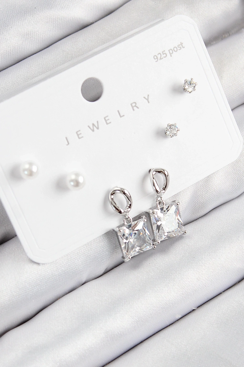 BFS Pirinç Zirkon Taşlı Sallantılı Kare Model Gümüş Renk 925 Ayar Gümüş Çivi Kadın Küpe Set