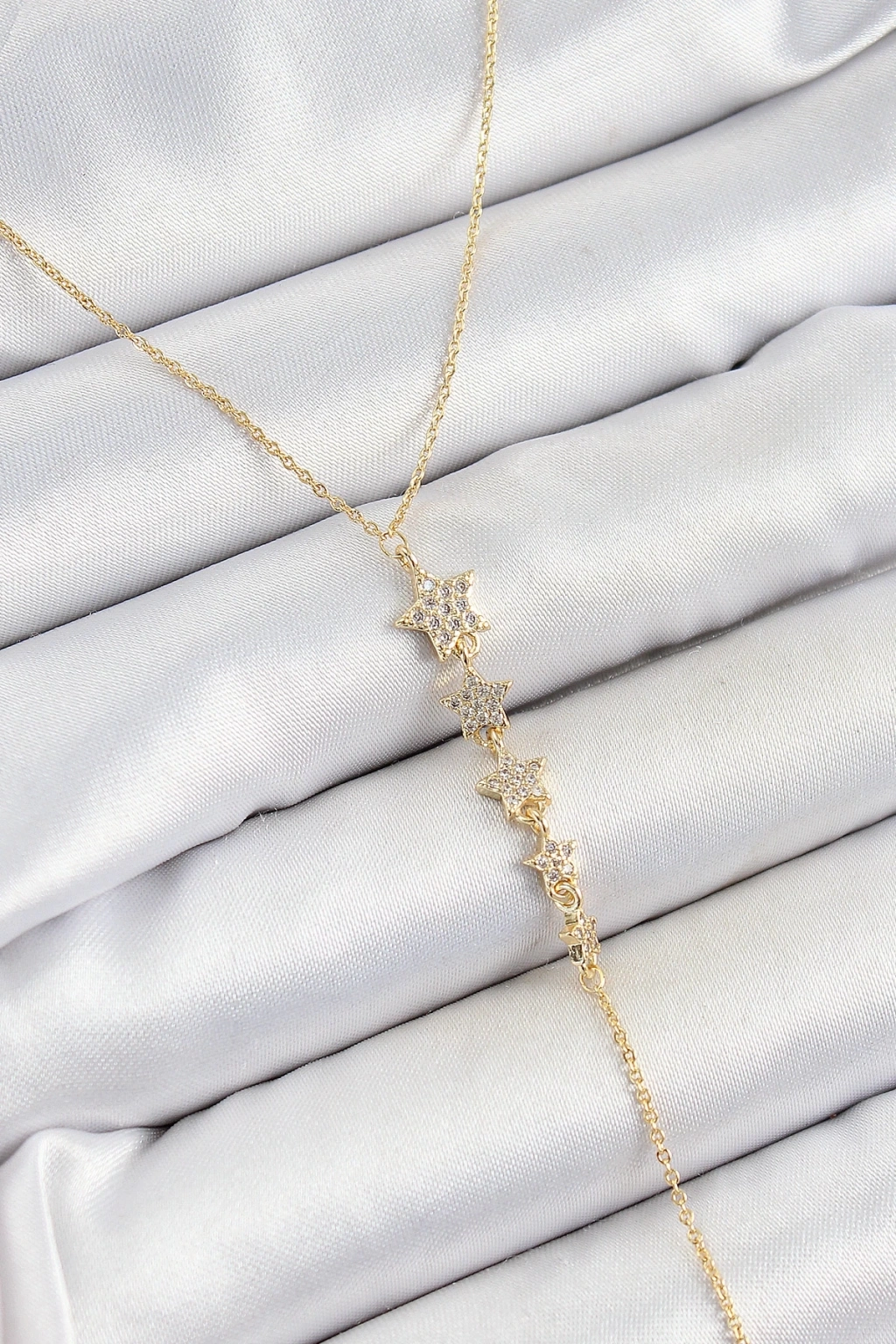 BFS Pirinç Zirkon Taşlı Sıralı Yıldız Figürlü Y Model Gold Renk Kadın Kolye