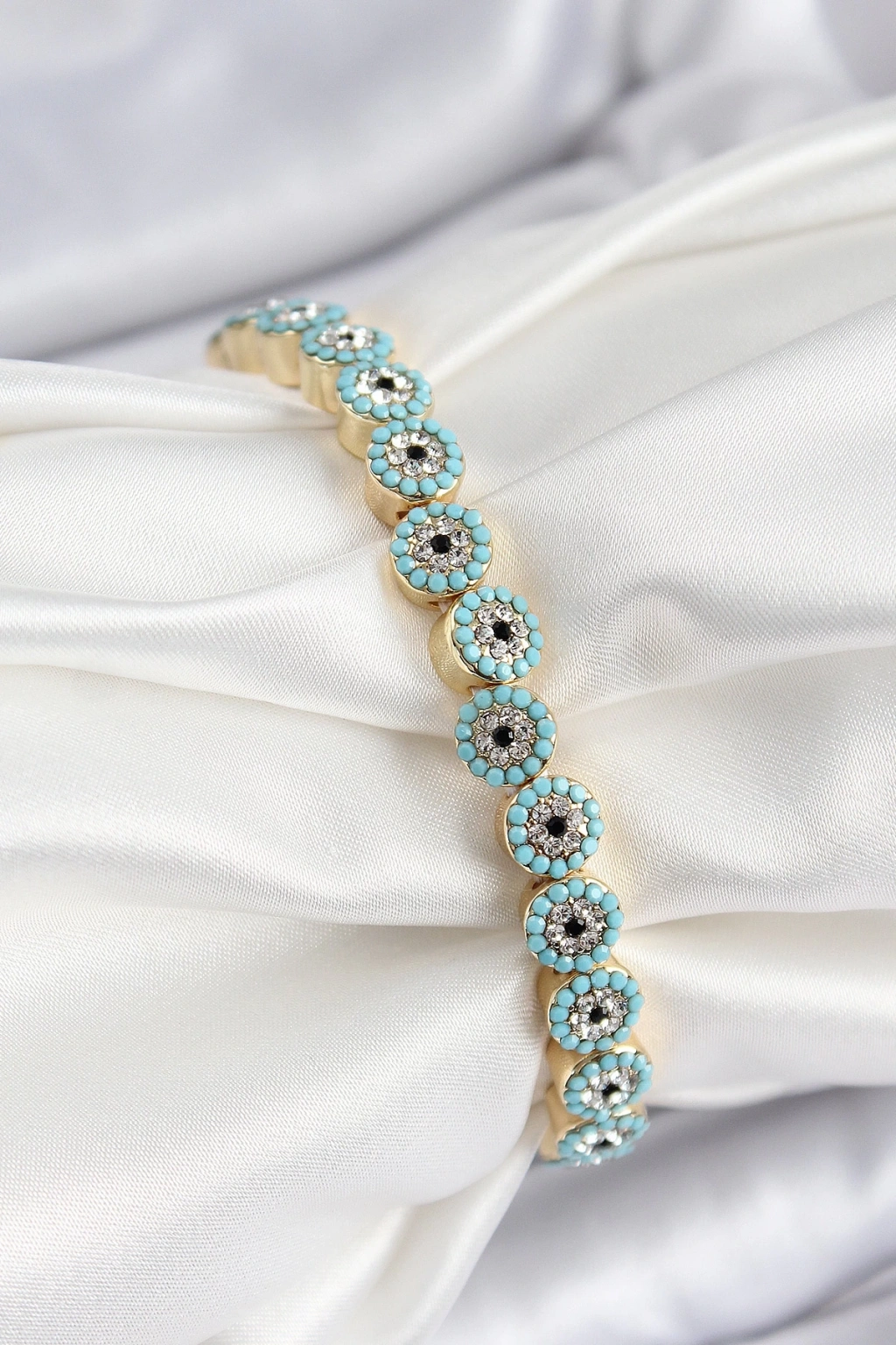 BFS Pirinç Zirkon Taşlı Turkuaz Nazar Model Gold Renk Lastikli Kadın Bileklik