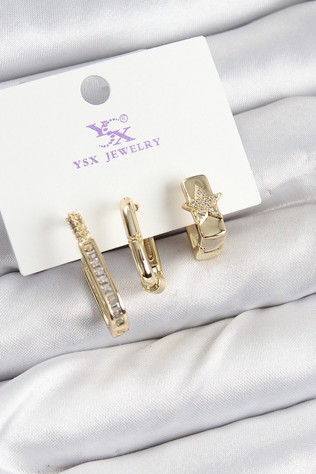 BFS Pirinç Zİrkon Taşlı Yıldız Model Gold Renk 3'lü Kadın Küpe