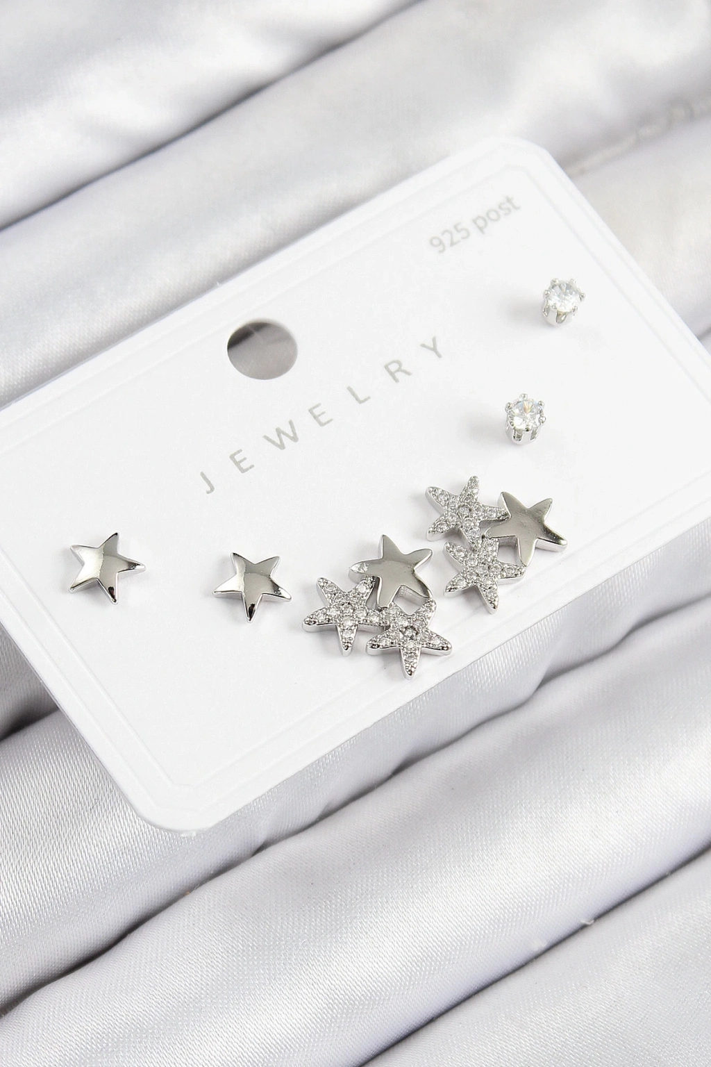 BFS Pirinç Zirkon Taşlı Yıldız Model Gümüş Renk 925 Ayar Gümüş Çivi Kadın Küpe Set