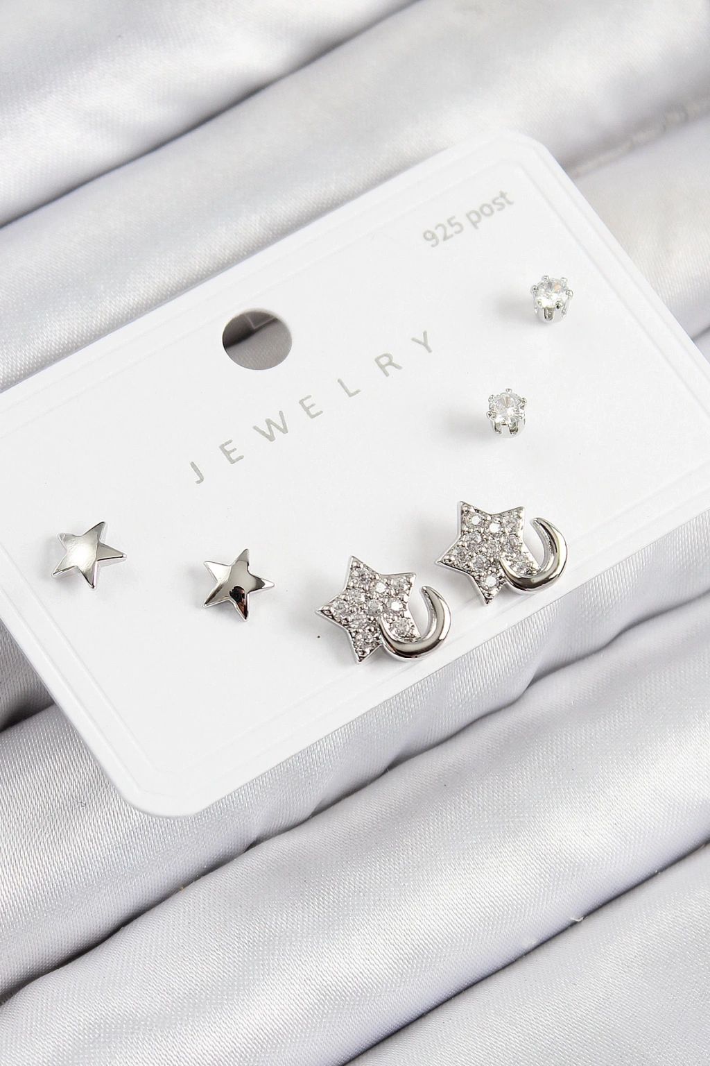 BFS Pirinç Zirkon Taşlı Yıldız Model Gümüş Renk 925 Ayar Gümüş Çivi Kadın Küpe Set