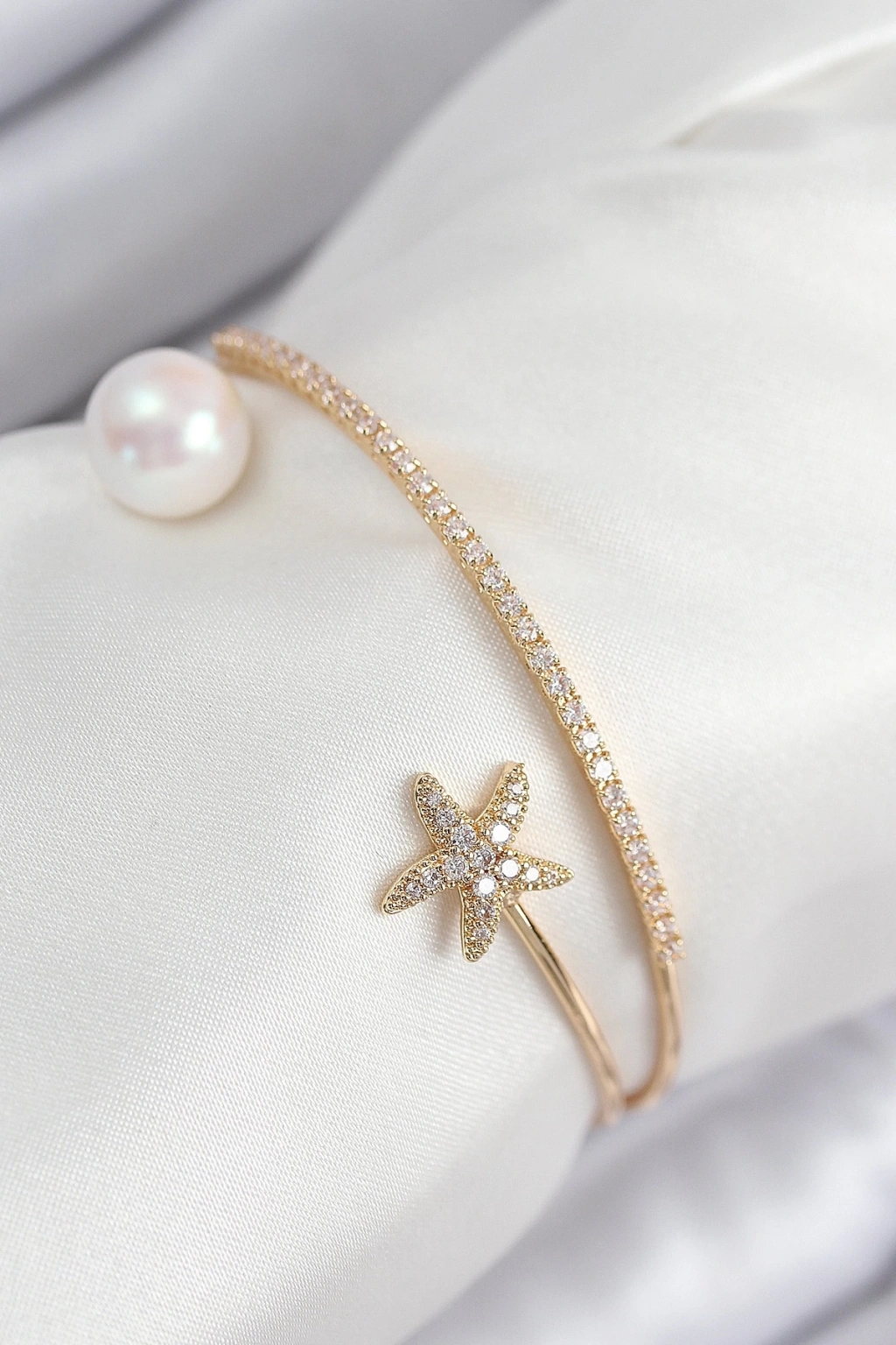 BFS Pirinç Zirkon Taşlı Yıldız Ve İnci Model Gold Renk Kadın Bileklik