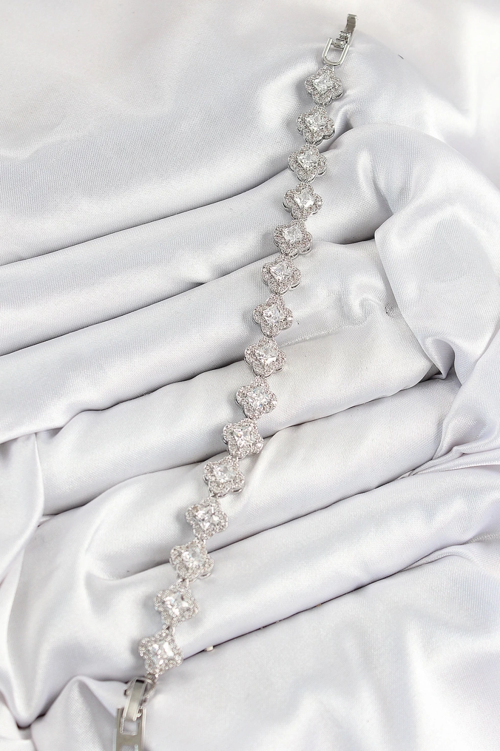 BFS Pirinç Zirkon Taşlı Yonca Baget Model Gümüş Renk VIP Seri Kadın Bileklik