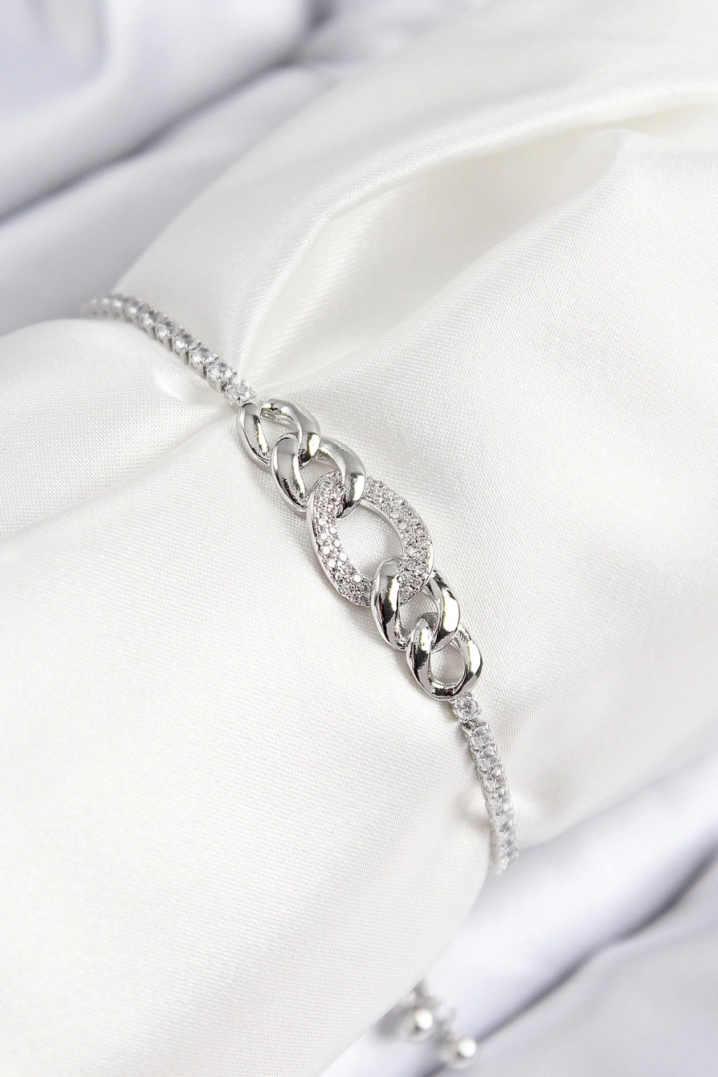 BFS Pirinç Zirkon Taşlı Zincir Model Gümüş Renk Asansörlü Kadın Bileklik