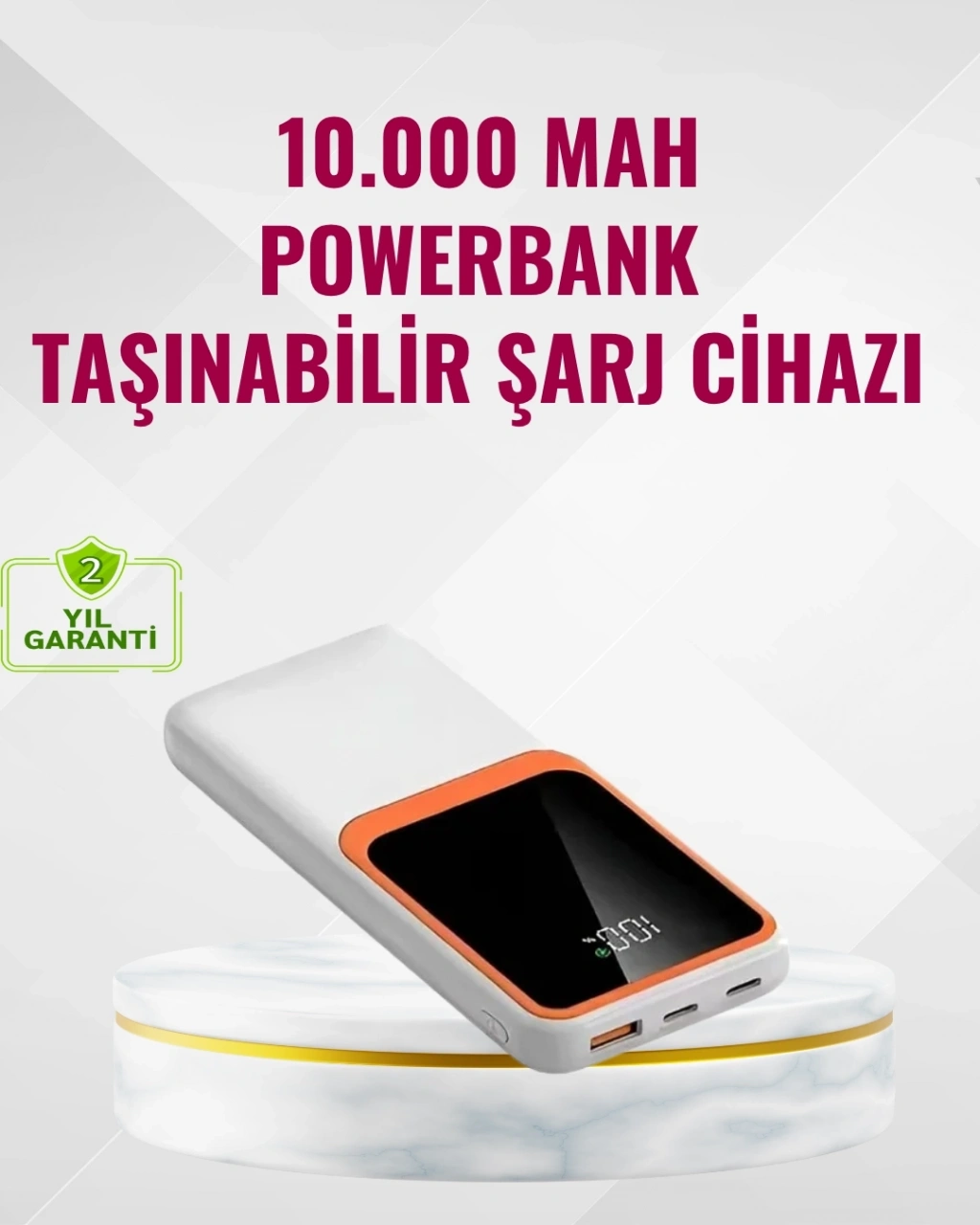 Bu kompakt ve hafif powerbank, 10000 mAh kapasitesiyle gün boyu enerji ihtiyacınızı karşılar. İki USB çıkışı ve Type-C portu sayesinde birden fazla cihazı aynı anda şarj edebilirsiniz.Lightning uyumluluğu sayesinde hem iOS hem Android cihazlarda sorunsuz kullanım sağlar. Dijital ekranı sayesinde kalan pil seviyesini kolayca takip edebilirsiniz.2.1A çıkış gücüyle hızlı şarj imkanı sunan bu model, zamandan tasarruf etmenizi sağlar. Kompakt boyutu, günlük kullanımda taşınabilirlik açısından büyük avantaj sunar.Zarif beyaz rengiyle modern bir görünüm kazanan powerbank, aynı zamanda dayanıklı bir yapıya sahiptir. Dış gövdesi çizilmelere ve darbelere karşı koruma sağlar.Ev, ofis veya seyahatlerde güvenle kullanabileceğiniz bu powerbank, güvenli şarj teknolojisi sayesinde cihazlarınızı korur ve uzun ömürlü performans sunar.