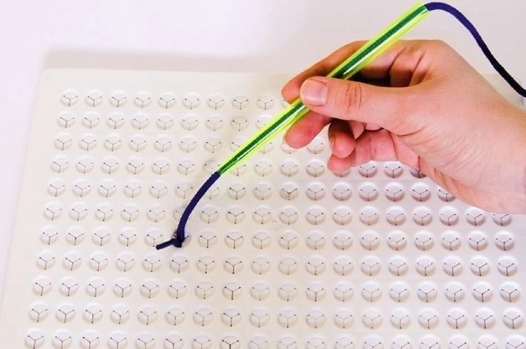Geometrinin en basit ve temel kurallarından biri üzerine kurulmuş bir mantığa sahip: "İki noktadan bir doğru geçer." Ürün, üzerinde özel tasarım delikleri olan, çok yumuşak bir maddeden basılmış bir oyun platformu olarak düşünülebilir. Bu deliklere özel tüplerin içerisinden geçirilmiş renkli ipleri tutturulabiliyorsunuz, bu sayede de delikler arasında renkli renkli çizgiler oluşturulabiliyor.