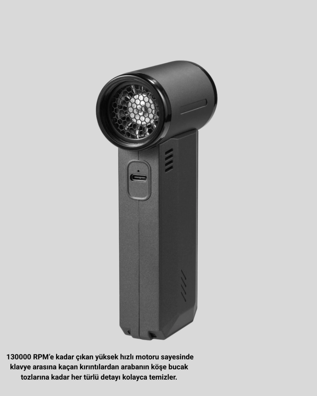 Temizliğin gücünü elinizde hissedin!130000 RPM motor gücüne sahip bu vakumlu temizlik cihazı, toz, kırıntı ve kirleri zahmetsizce ortadan kaldırır.Hem hava üfleme hem vakum özelliği ile iki işlevi tek gövdede birleştirir.Üç kademeli hız seçeneği ile farklı temizlik ihtiyaçlarına uyum sağlar.Klavye aralıkları, araç içi koltuk altları, pencere kenarları gibi ulaşılması zor bölgelerde etkili temizlik sunar.Type-C şarj desteği hızlı enerji yüklemesi yaparak cihazı uzun süreli kullanıma hazır hale getirir.Şarjlı yapısı sayesinde kablo karmaşası olmadan özgürce kullanılabilir.Kompakt ve taşınabilir tasarım, her yere kolayca sığar.Dayanıklı gövdesi uzun ömürlü performans sunarken, farklı başlıkları sayesinde detaylı temizlik sağlar.Evde, ofiste veya aracınızda daima elinizin altında bulunacak bir temizlik çözümüdür.