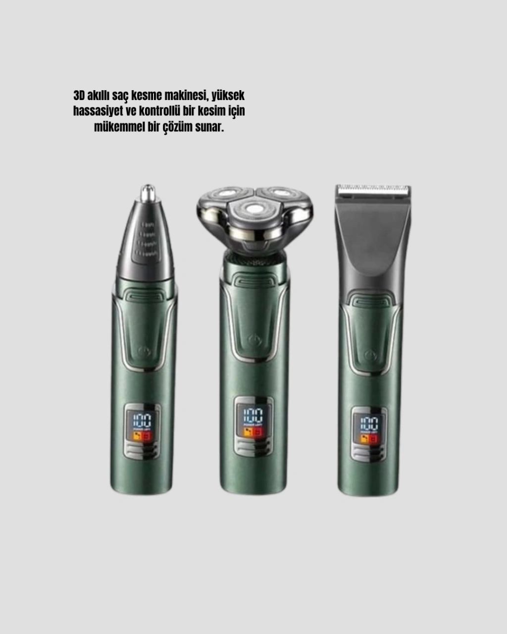 Tüm kişisel bakım ihtiyaçlarınız için tek cihaz! Bu şarjlı ve kablosuz profesyonel bakım seti, saç, sakal, burun ve kulak tüylerini kolayca şekillendirmenizi sağlar. Üç farklı başlığıyla vücudun her bölgesinde güvenli, hassas ve konforlu bir tıraş deneyimi sunar.Paslanmaz çelik bıçakları, uzun ve yoğun sakallarda bile etkili performans gösterir. 3D akıllı kesim teknolojisi, yüksek hassasiyet ve maksimum kontrol sağlar. Burun ve kulak tüyleri için özel tasarlanmış başlık, ağrısız ve çekmesiz temizlik imkânı sunar. Hafif, taşınabilir yapısı sayesinde seyahatlerde ideal bir çözümdür.