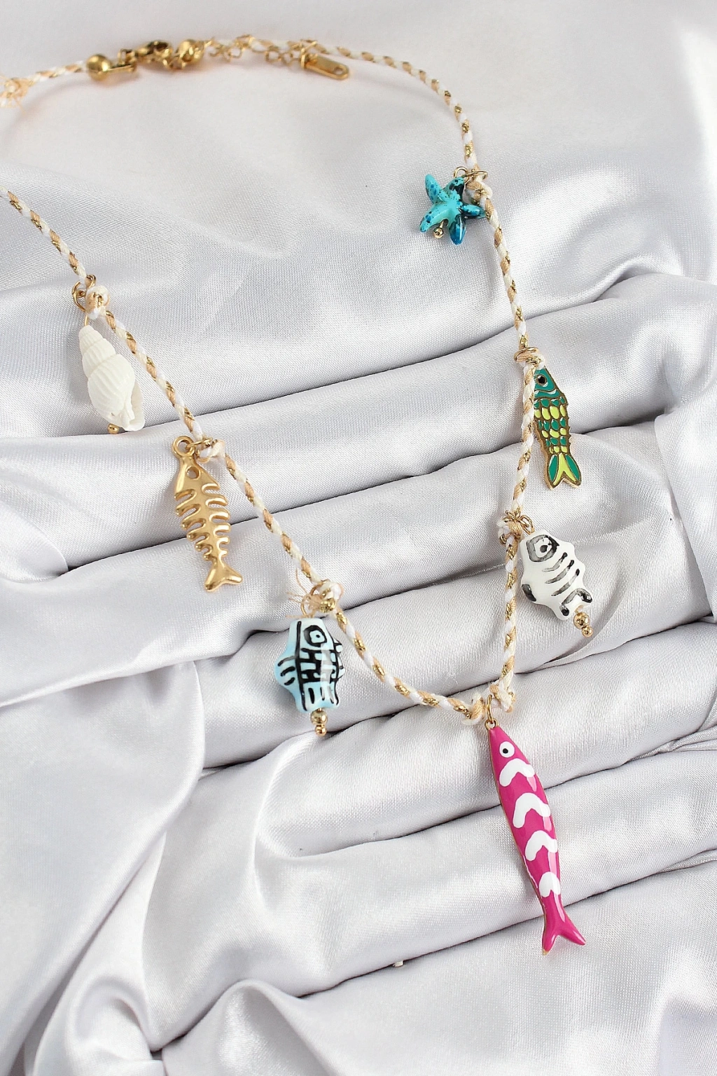 BFS Seramik Motifli Pembe Balık Figürlü Model Krem İp Kadın Kolye