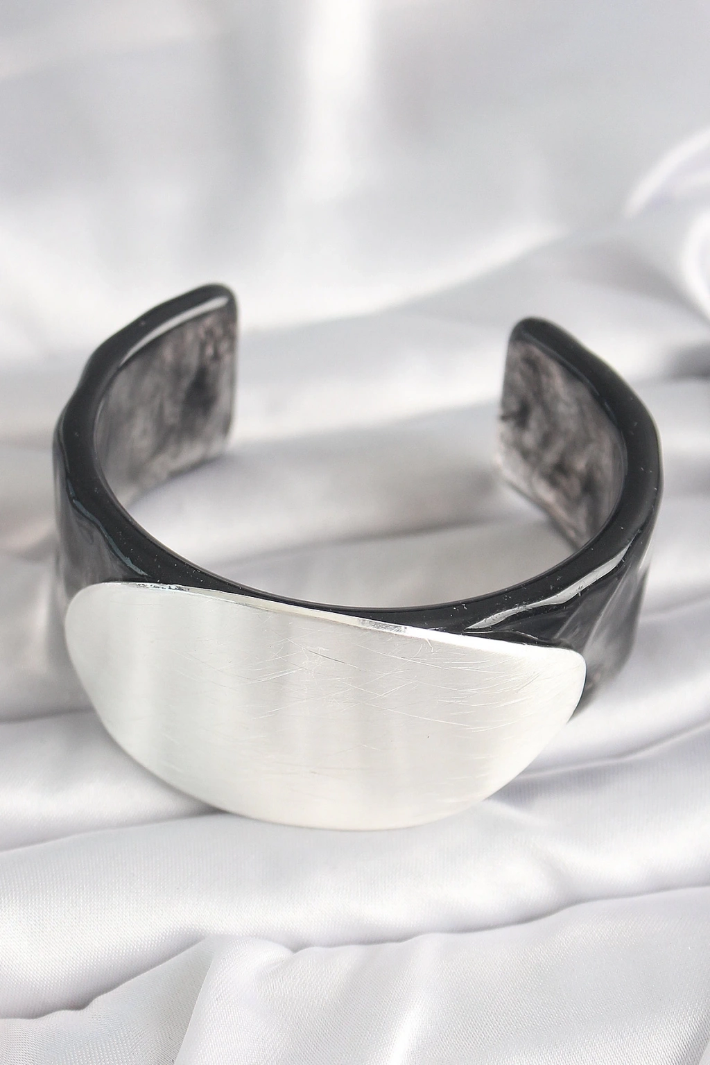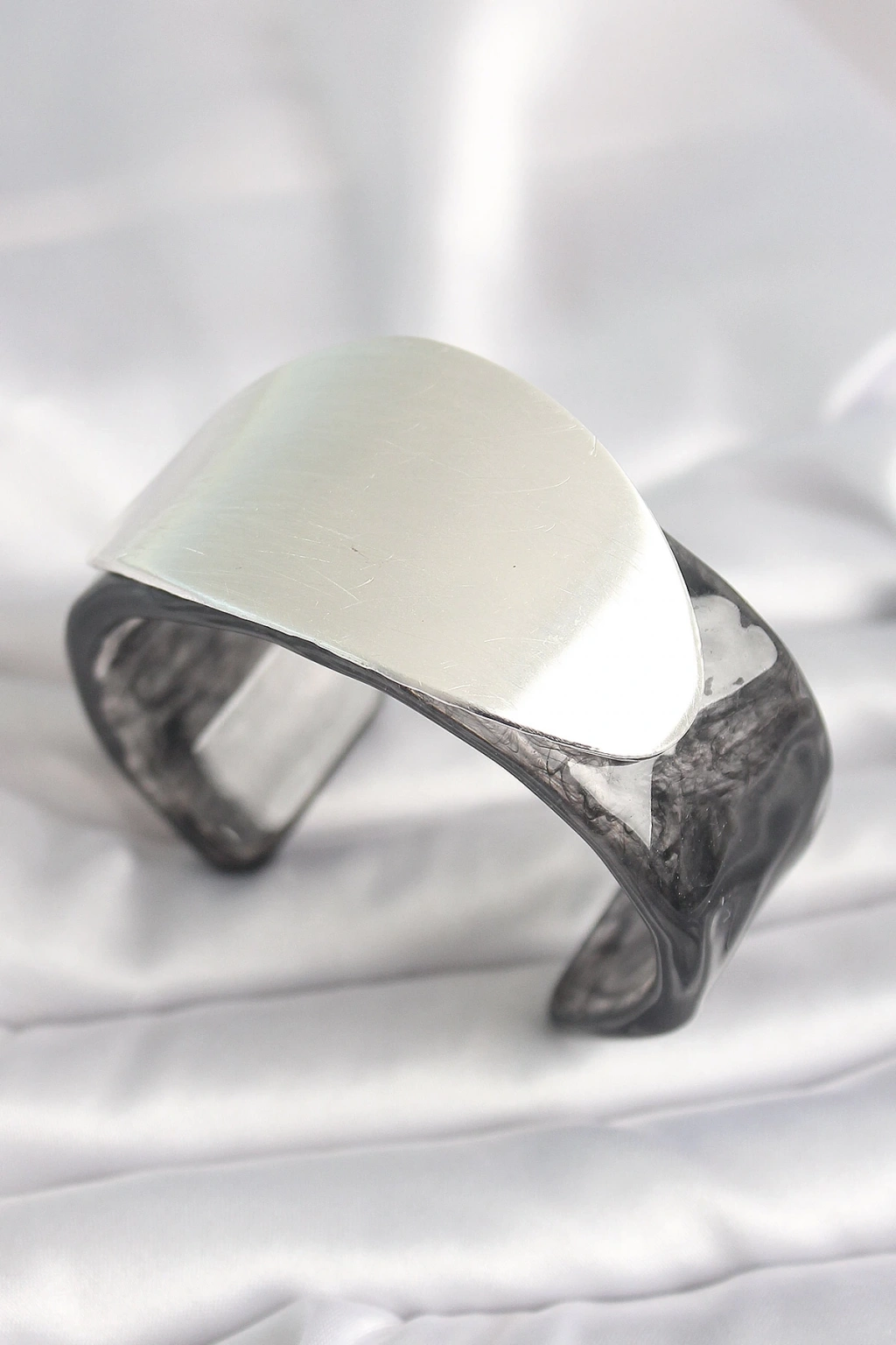 BFS Siyah Mermer Desen Akrilik Plastik Gümüş Oval Plaka Model Vintage Kadın Bilezik