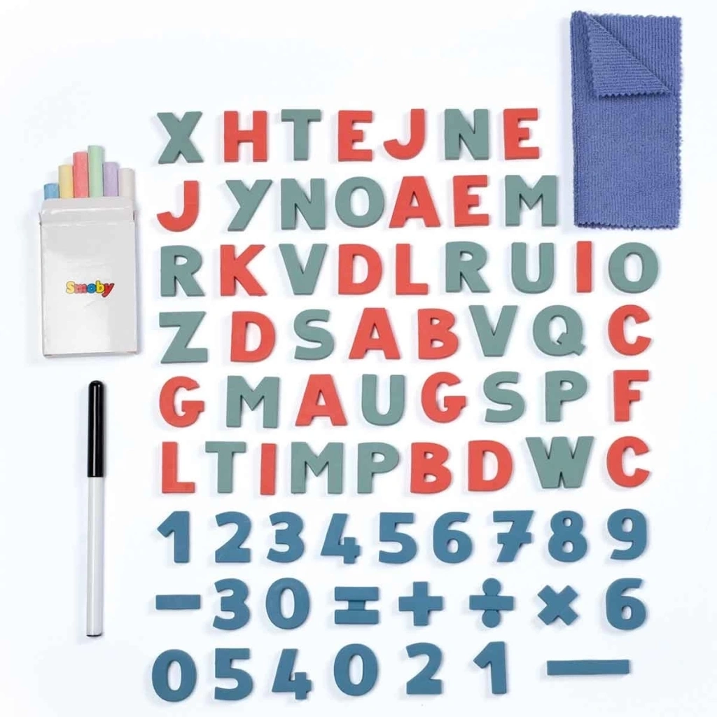 Aksesuarlar toplam 80 parçadan oluşuyor: 6 farklı renkten oluşan tebeşir seti, sünger, silinebilir kalem ve 72 adet mıknatıslı harf ve rakam.
