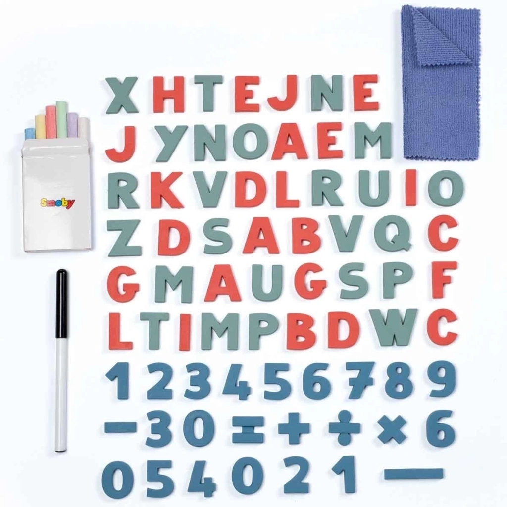 Kapsamlı aksesuarlar arasında bir sünger, siyah keçeli kalem (çözünür),72 manyetik harf ve rakam ve renkli bir tebeşir seti yer alır.