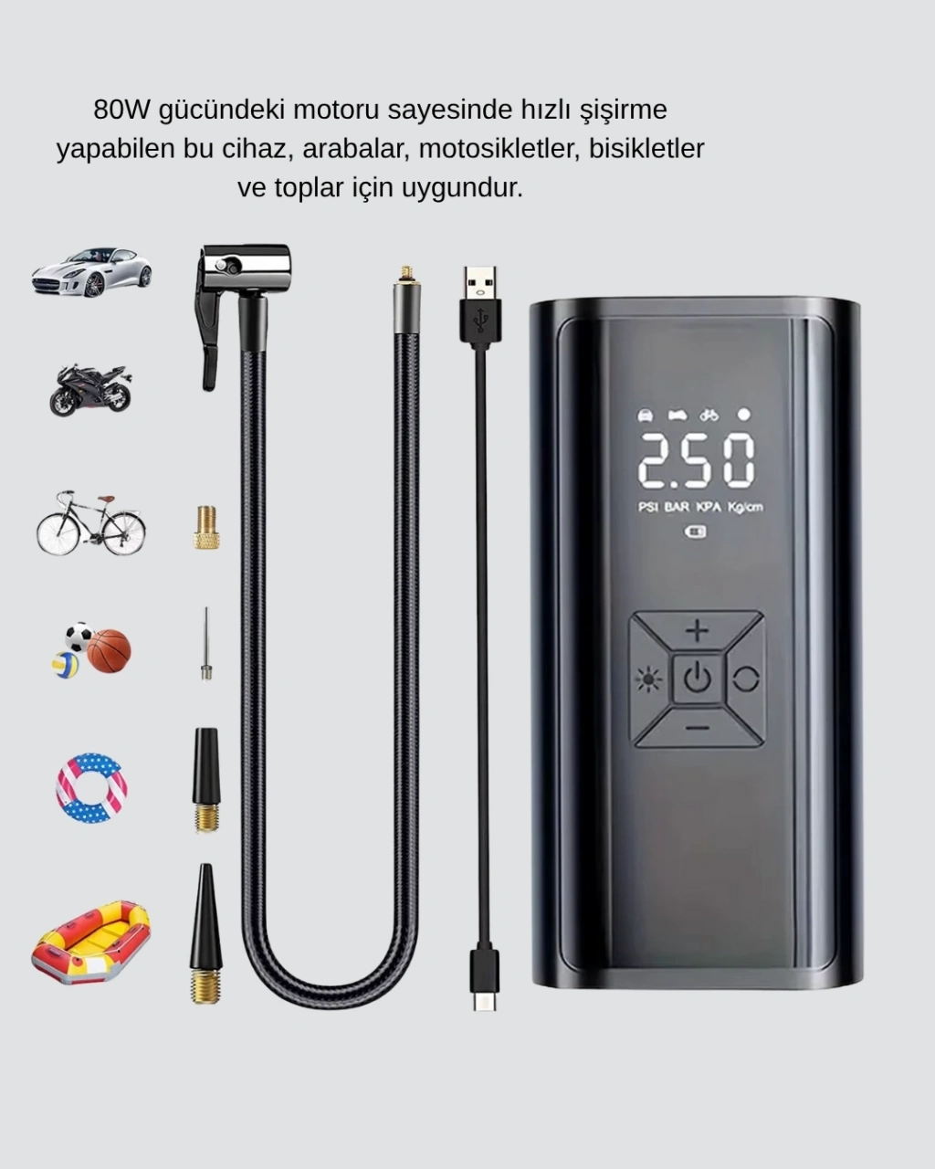 Her yolculukta güvenle ilerleyin!Bu kablosuz taşınabilir lastik pompası, güçlü 80W motoru ile dakikalar içinde lastikleri şişirir.Kompakt ve hafif yapısı sayesinde aracınızda kolayca taşınabilir ve her an kullanıma hazırdır.Dijital ekranlı kontrol panel, hava basıncını net şekilde gösterir.Otomatik durdurma sistemi, hedeflenen değere ulaşıldığında cihazı otomatik olarak kapatarak fazla şişirmeyi önler.Dört farklı mod seçeneği, bisiklet, araba, motosiklet veya top gibi farklı kullanım alanlarında maksimum performans sağlar.LED aydınlatma ve SOS fonksiyonu, gece sürüşlerinde ve acil durumlarda güvenlik sunar.Dayanıklı gövde yapısı, uzun süreli kullanım için tasarlanmıştır.12V uyumluluğu ve kablosuz kullanımıyla, seyahatlerde yanınızda taşıyabileceğiniz mükemmel bir araçtır.