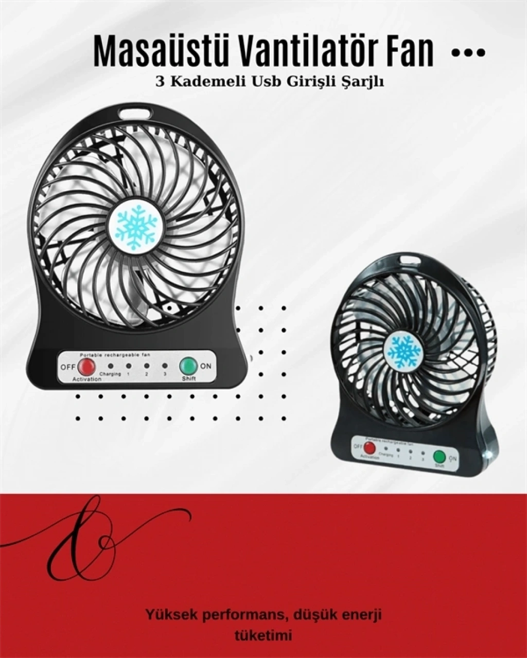 Bu kompakt ve şık USB mini fan, yaz aylarında serinlemenin en pratik yollarından biri! 3 kademeli hız ayarı sayesinde hava akışını dilediğiniz gibi ayarlayabilir, hem evde hem ofiste konforunuzu artırabilirsiniz. USB girişi sayesinde bilgisayarınıza, powerbank’e ya da adaptörünüze kolayca bağlanarak çalışır. Sessiz çalışan motoru, yüksek verimli serinlik sunarken sizi rahatsız etmez.Taşınabilir yapısı ve şarjlı özelliğiyle çantanızda taşıyabilir, istediğiniz her yerde kullanabilirsiniz. Ekstra ışık modu ile gece kullanımı da mümkündür. Düşük enerji tüketimi ile tasarrufludur. Hem masaüstü vantilatör olarak hem de notebook soğutucu olarak işlev görebilir. Paket içerisinde şarj edilebilir pil ve şarj kablosu ile birlikte gelir.