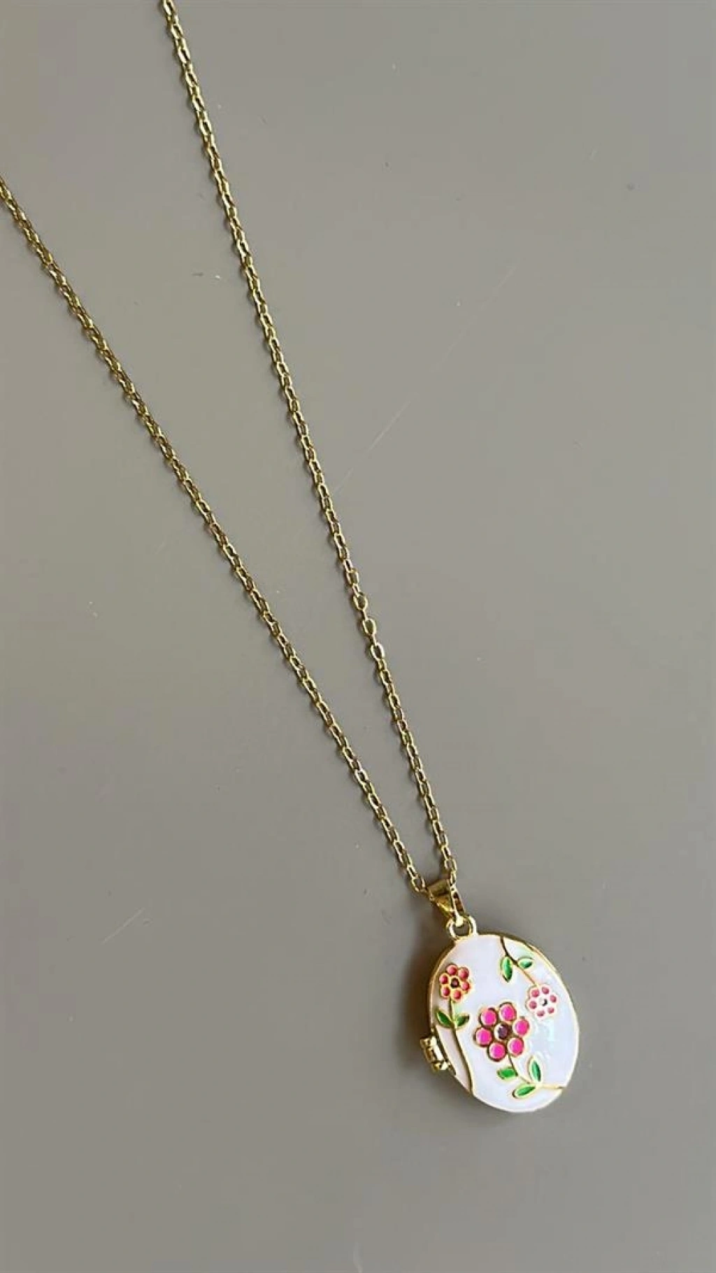 İncili Etnik Desen Kapaklı Kolye - Beyaz