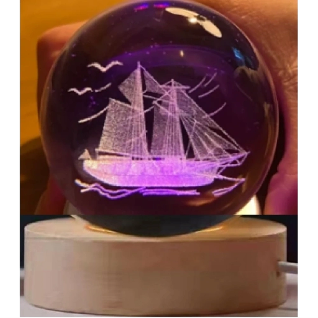 Dekoratif Gemi Tasarımlı Ahşap Altlıklı Işıklı Cam Küre Cam:6cm Ahşap:2cm