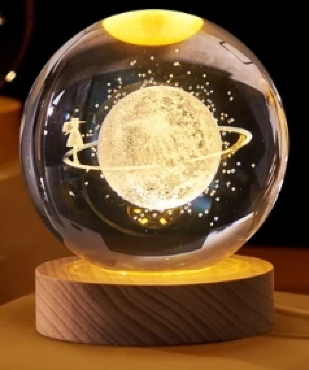Dekoratif Satürn Kız Tasarımlı Ahşap Altlıklı Işıklı Cam Küre Büyük Boy Cam:8cm Ahşap:2cm