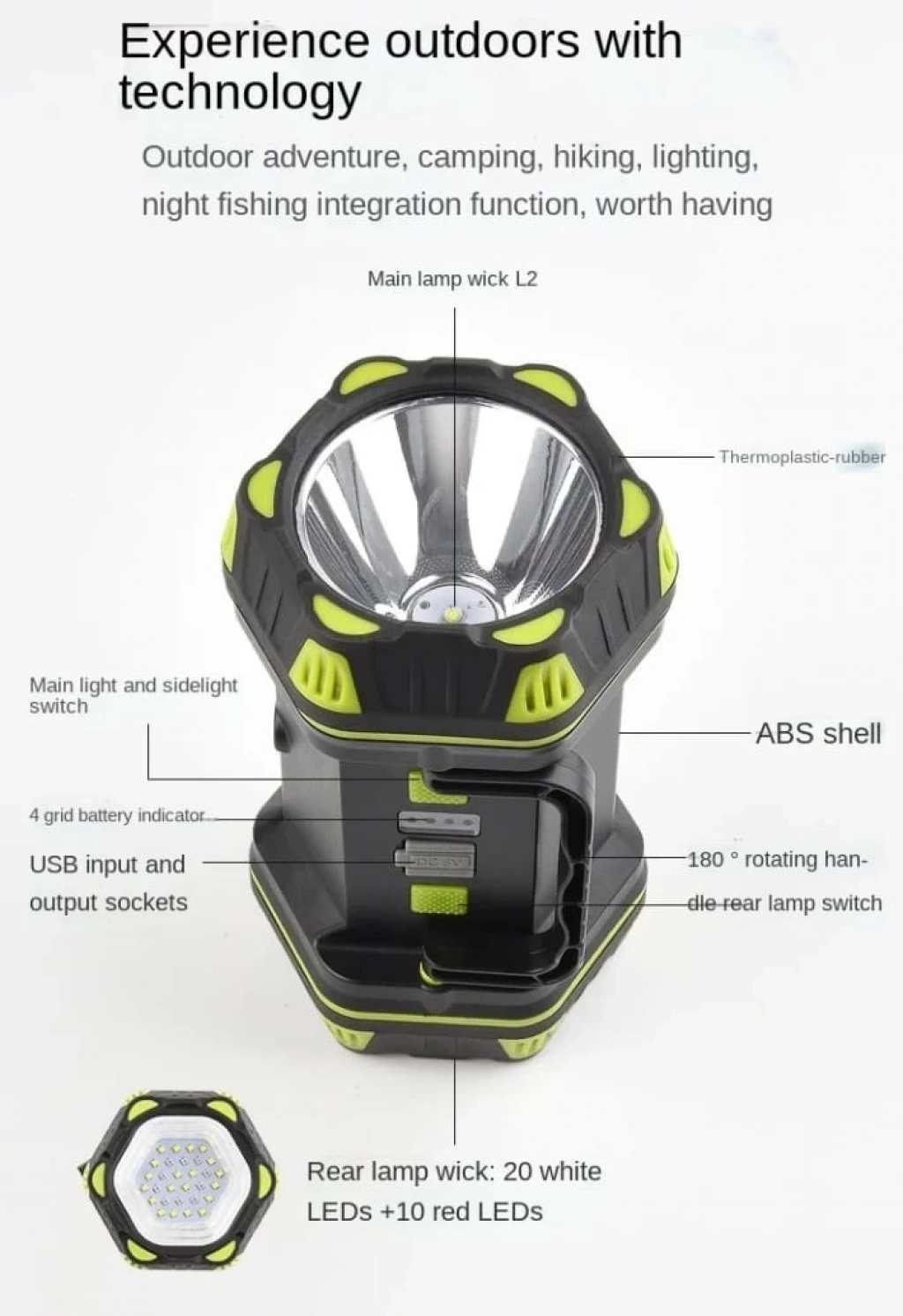 [Çalışma dişli]: ana ışık 4 dişli: ana ışık L2 güçlü Işık-ana ışık L2 zayıf ışık-sidelight güçlü ışık-sidelight zayıf ışık Arka ışık 4 dişli: arka ışık güçlü ışık-arka ışık zayıf ışık-kırmızı ışık-kırmızı ışık yanıp sönen [Uygulanabilir pil]: dahili 4800mah lityum pil i [Ürün malzemesi]: TPR olarak ABS [Çalışma gerilimi]: 3.7V