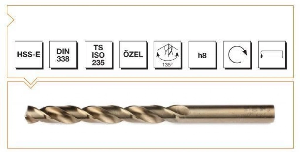 SİLİNDİRİK SAPLI ALTIN SERİ 5 MM MATKAP UCU TS ISO 235, HSSE %5 Co alaşımlı yüksek hız çeliği, özel profil, uç açısı 135°, çap toleransı h8, sağ kesme yönlü