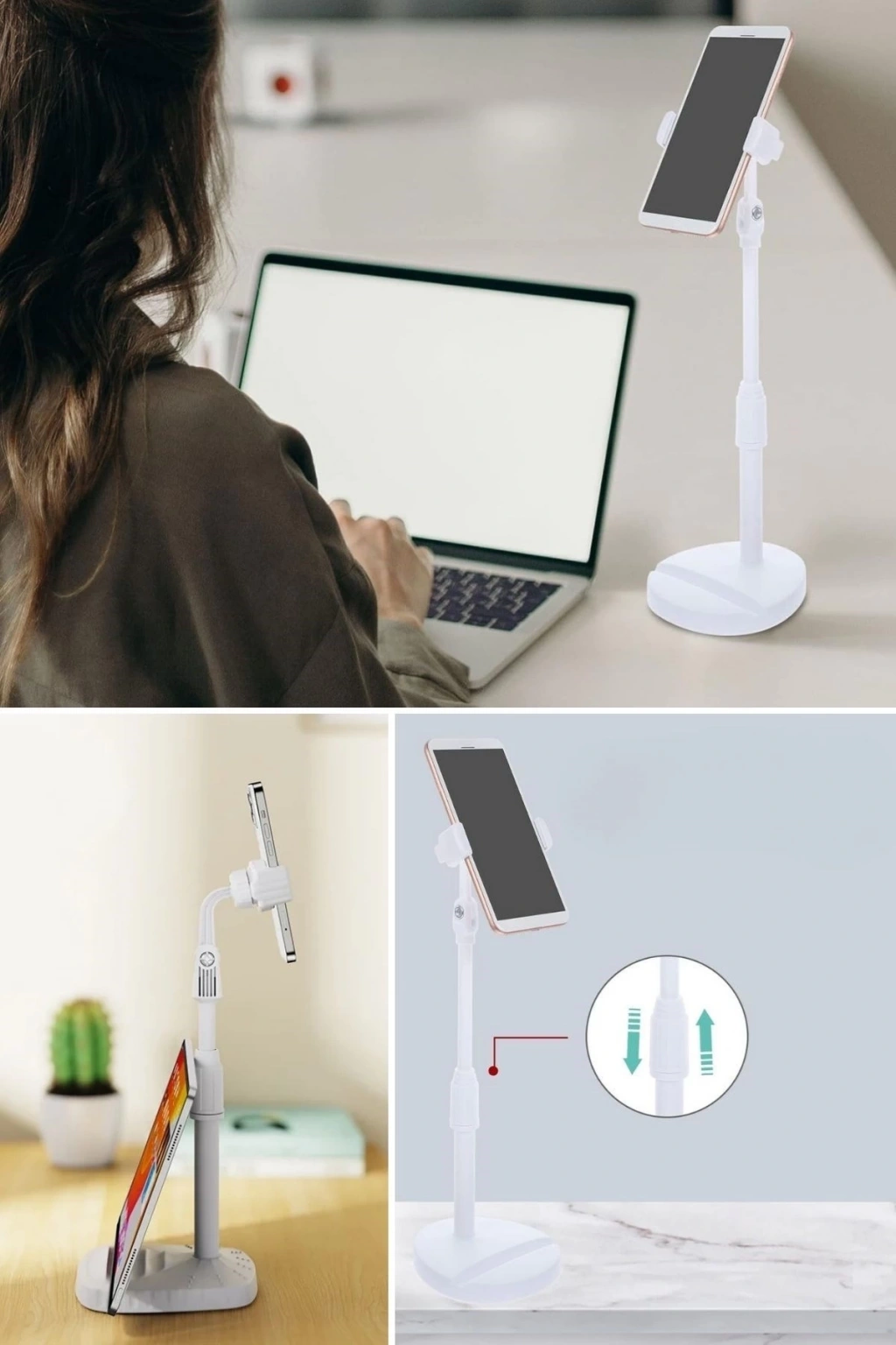 Masa Üstü Tablet ve Telefon Tutucu Plastik Aparat, Beyaz renkli şık tasarımı ile hem tablet hem de telefonlarınız için ideal bir stand çözümüdür. Çalışma masasında, mutfakta, yatak odasında veya ofiste, cihazlarınızı dik ya da yatay konumda sabit tutarak kullanım kolaylığı sağlar.