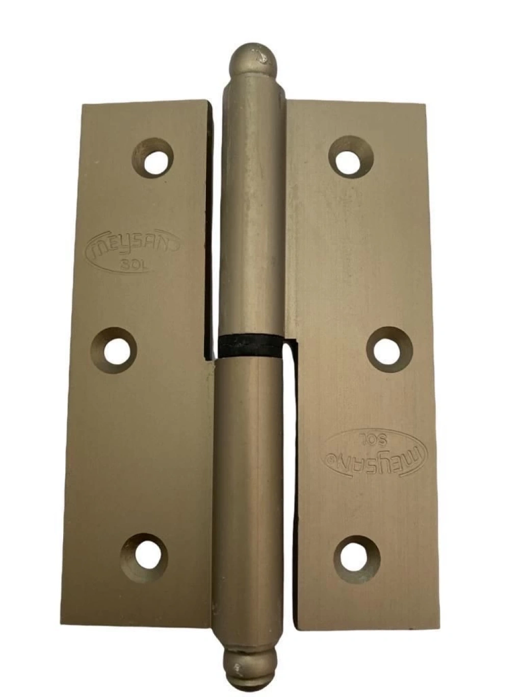 Alüminyum Okka Menteşe Sol 10 cm, kapı kapakları, açılır kapanır malzemelerde kullanılan, bir mille birbirine tutturulmuş, biri sabit, öbürü hareketli iki parçadan oluşmuş metal menteşedir.
