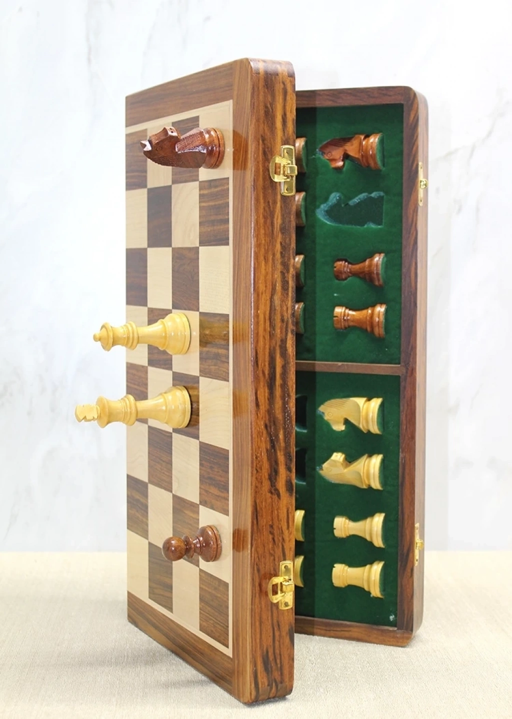 Özel Vernikli Mıknatıs Taşlı Ahşap Katlanabilir Kutulu Satranç Oyunu 25 Cm G222