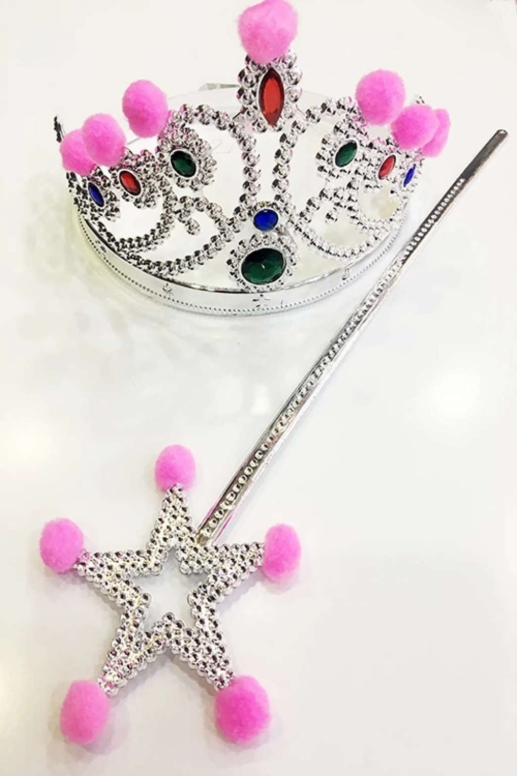 Pembe Ponponlu Gümüş Renk Prenses Tacı Ve Gümüş Renk Prenses Asası