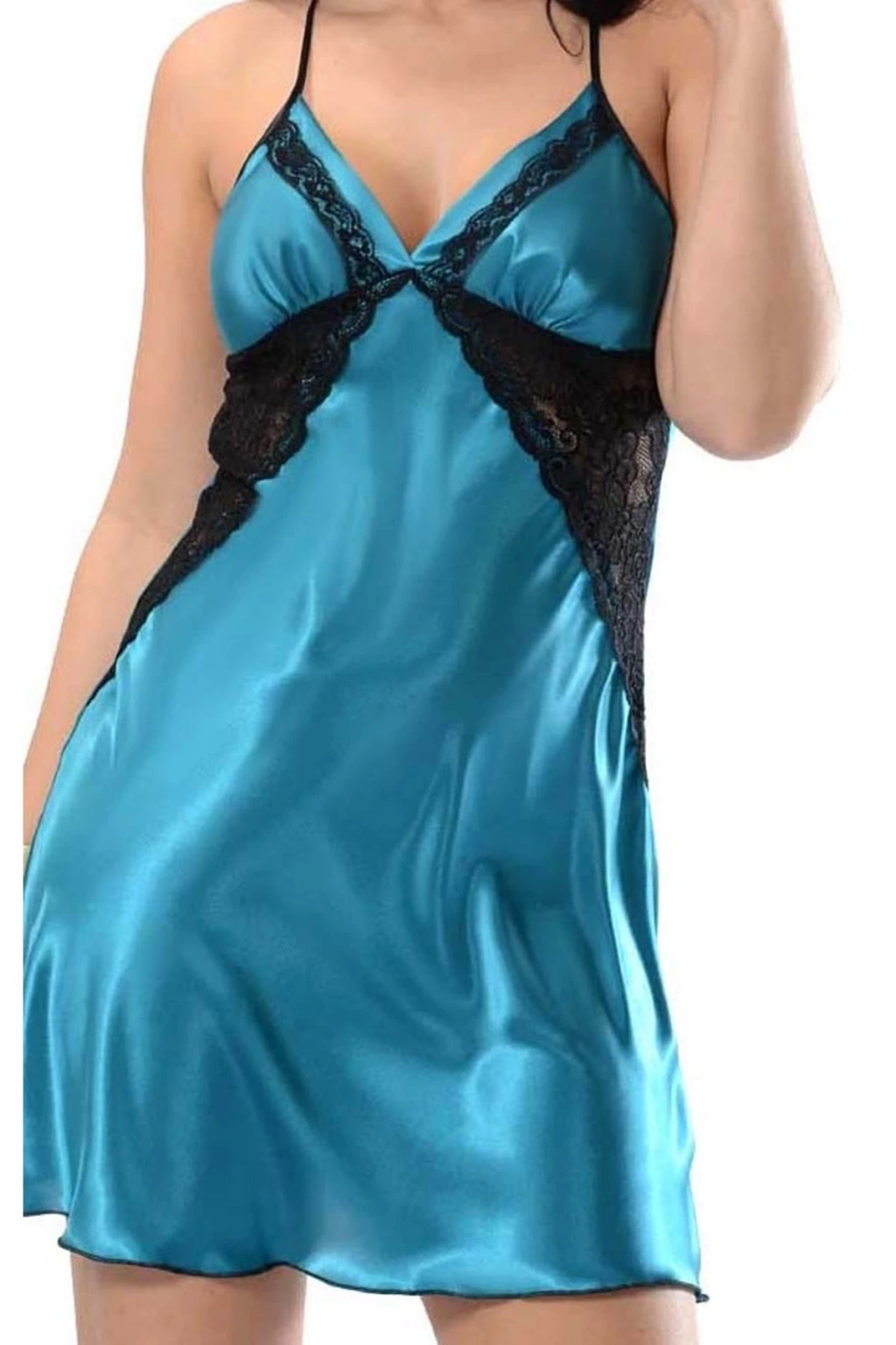 Petrol Yeşili Dantelli Saten Gecelik - M-393