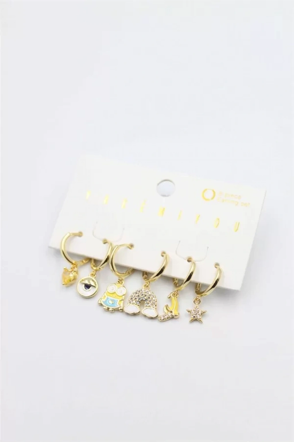 Mey İthalat® 316L Çelik Gold Renk 6'lı Set Charmlı Kadın Küpe