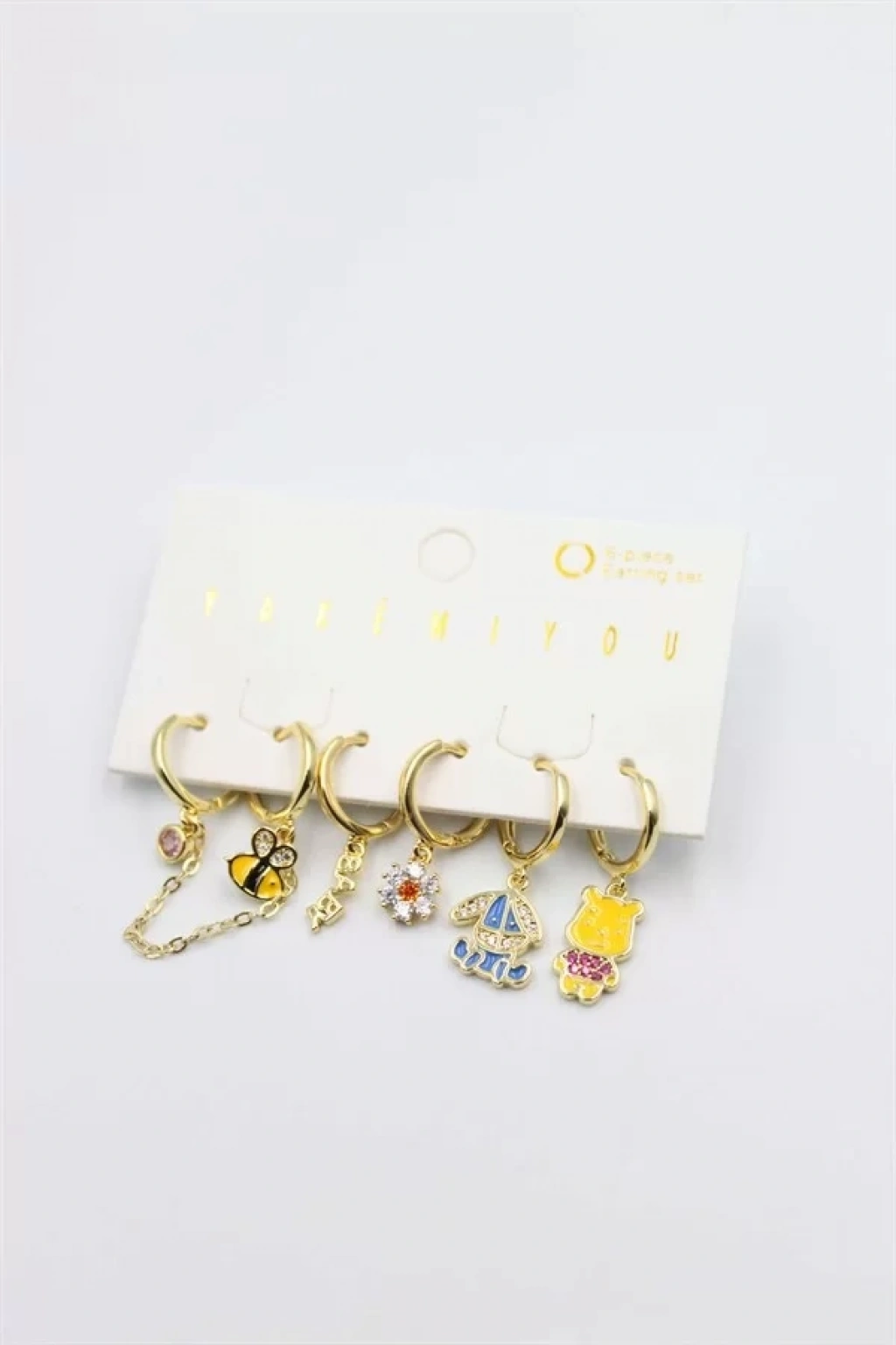 Mey İthalat® 316L Çelik Gold Renk 6'lı Set Charmlı Kadın Küpe