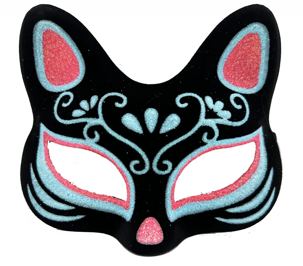• Siyah süet kaplama ve mavi ve kırmızı simlerle süslenmiş, kedilerin sevimliliğini ve gizemini yansıtan bir maske tasarımı.