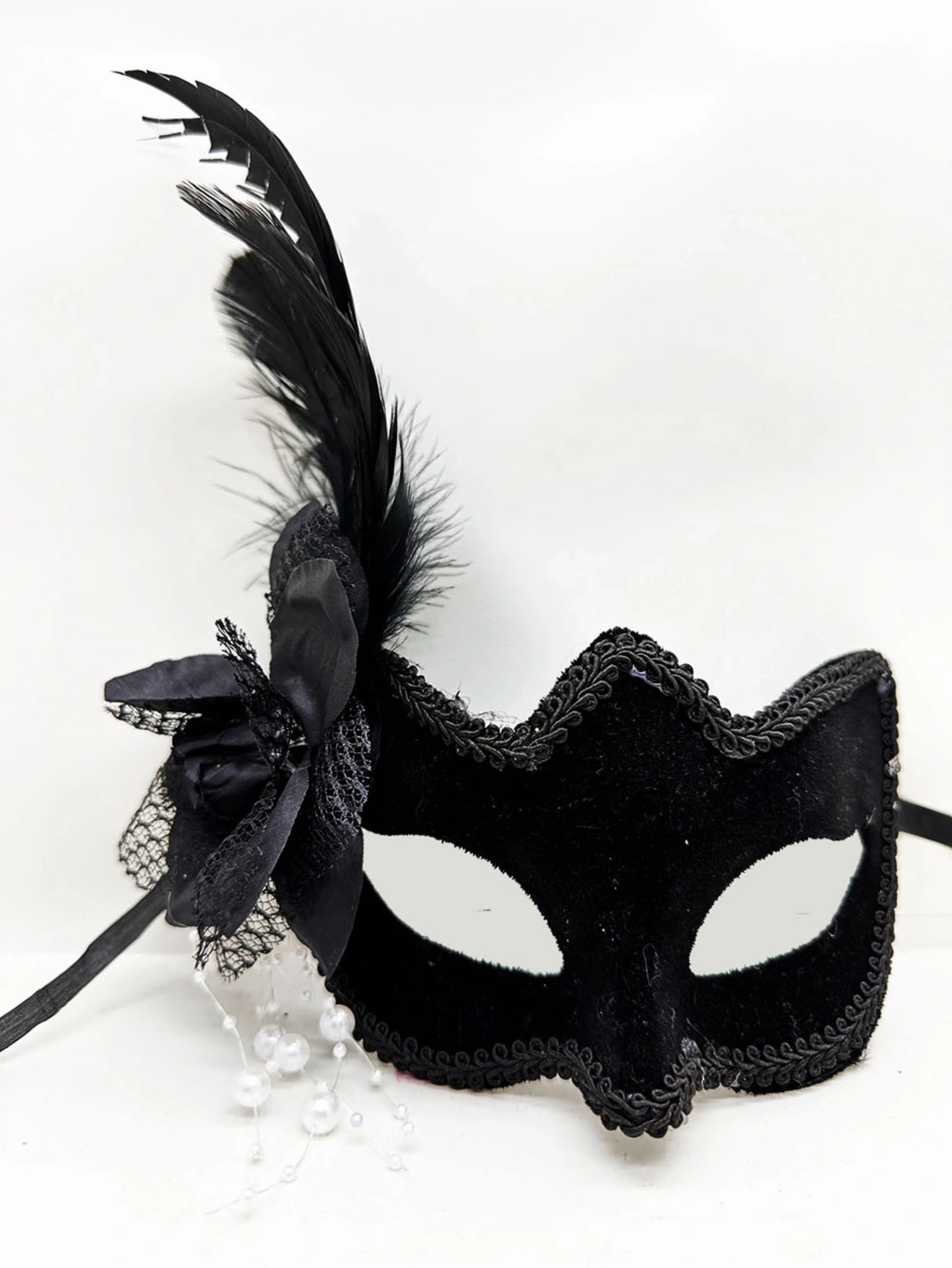 Siyah Renk Süet Kaplama Yandan Tüylü Beyaz İncili Parti Maskesi, balolar, maskeli partiler gibi özel günlerde gizemli ve göz alıcı bir görünüm elde etmek isteyenler için mükemmel bir seçimdir. Yumuşak süet kaplaması ve zarif beyaz incileri ile bu maske sizi partinin yıldızı yapacak.