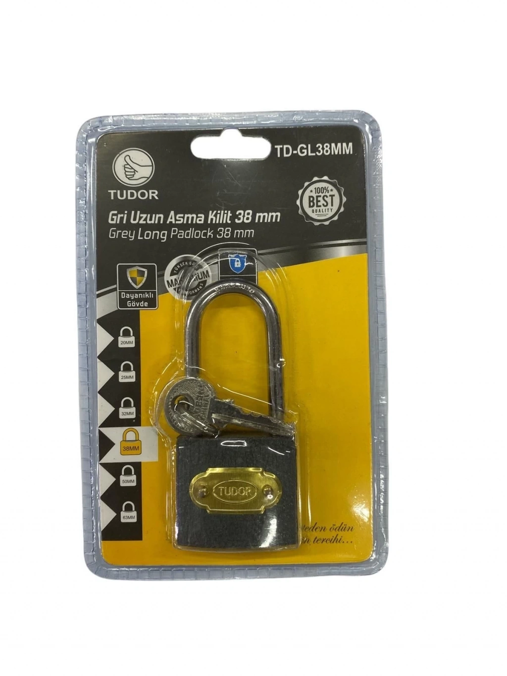Tudor 38 mm Uzun Gri Asma KilitKorozyana karşı pirinç silindirKrom kaplama çelik kancaPaslanmaz yaylarDarbeye dayanıklı demir gövde