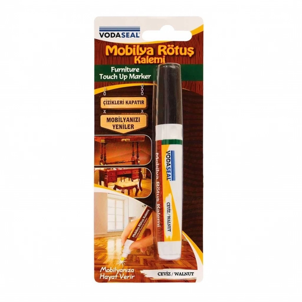Mobilya Rötuş Kalemi ; ahşap mobilya, parke, pencere, çerçeve, kapı, banyo dolabı vb. tüm ahşap yüzeylerde zaman içerisinde oluşan derin veya kılcal çizikleri, oyukları, ezik, çatlak, çukur bölgeleri ve genel olarak darbeye veya aşınmaya bağlı yıpranmış ve hasar görmüş bölgeleri yenilemek için tasarlanmıştır.